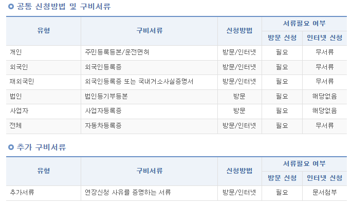 - 방문 신청: 차량등록사업소, 구청, 자동차검사소